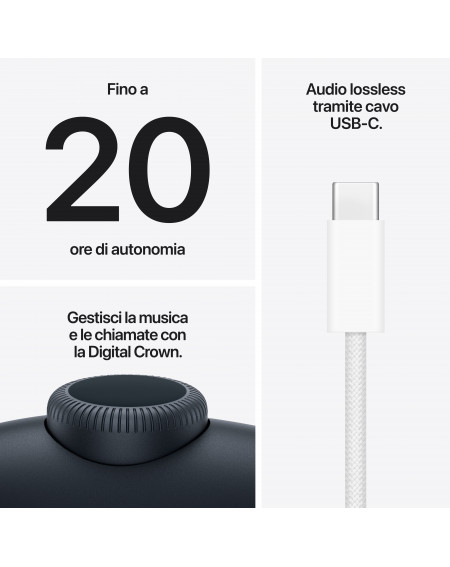 - AUDIO LOSSLESS VIA USB-C — Collega le tue AirPods Max 2 al tuo dispositivo con un cavo USB-C per goderti tutti i dettagli delle registrazioni originali. E puoi anche caricarle con lo stesso cavo che usi per gli altri dispositivi Apple.