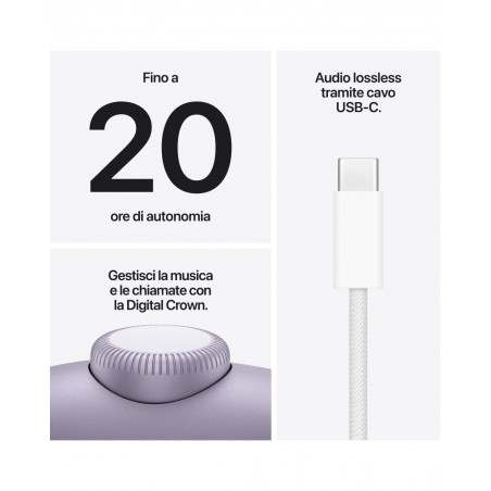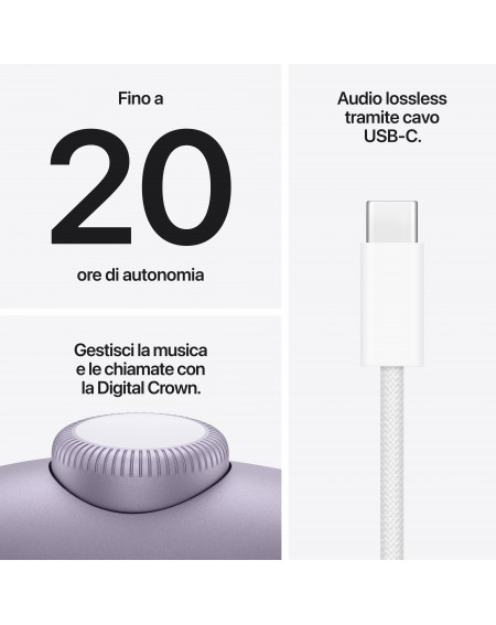 - AUDIO LOSSLESS VIA USB-C — Collega le tue AirPods Max 2 al tuo dispositivo con un cavo USB-C per goderti tutti i dettagli delle registrazioni originali. E puoi anche caricarle con lo stesso cavo che usi per gli altri dispositivi Apple.