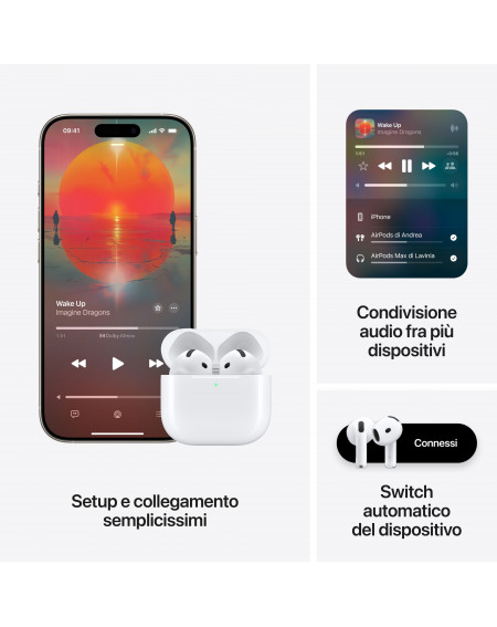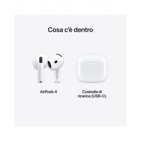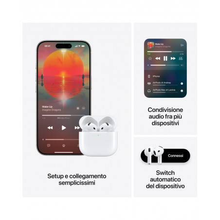 - UN’ESPERIENZA MAGICA – Di’ “Ehi Siri” o anche solo “Siri” per ascoltare un brano, fare una chiamata o controllare i tuoi impegni: 3 grazie alle interazioni con Siri,1 per rispondere sì o no quando ti chiede qualcosa, ora puoi semplicemente annuire o scuotere delicatamente la testa.1 Per abbinare gli AirPods 4, ti basta avvicinarli al tuo dispositivo e toccare Connetti sul display. Usando “Condivisione audio”, è facile godersi in coppia un brano o un film, ognuno con il proprio paio di AirPods. 4 In più, gli auricolari hanno un sensore che rileva il contatto con la pelle, quindi fanno partire automaticamente l’audio quando li indossi, e lo mettono in pausa non appena li togli. E se perdi di vista gli AirPods o la custodia di ricarica, puoi rintracciarli con l’app Dov’è.5