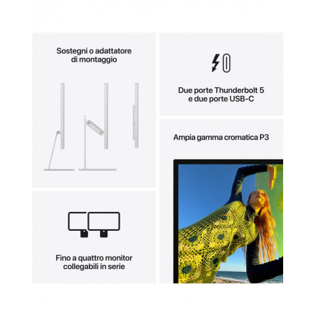 Studio Display ha due porte Thunderbolt 5. Con una puoi collegare e ricaricare il tuo portatile Mac, e con l’altra puoi alimentare accessori ad alta velocità o collegare in serie altri monitor. E puoi usare le due porte USB‑C per i dischi esterni o per ricaricare il tuo iPhone.