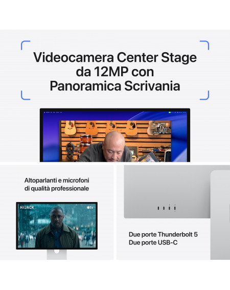 Studio Display XDR ha una videocamera Center Stage da 12MP che offre una qualità delle immagini straordinaria e prestazioni ottimali anche con poca luce. Durante le videochiamate rimani sempre perfettamente al centro della scena, persino se ti muovi o se altre persone si uniscono a te. Panoramica Scrivania mostra contemporaneamente sullo schermo il tuo volto e una vista dall’alto del tuo spazio di lavoro. E la funzione Edge Light crea un anello di luce virtuale lungo il profilo del display, così il tuo viso risulta sempre ben illuminato.