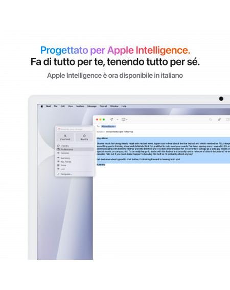 Progettato per Apple Intelligence.Ti stupirAI. Apple Intelligence è il sistema di intelligenza personale che rende più facile scrivere, creare e fare tutto ciò che vuoi. E grazie a funzioni di ultima generazione per la tutela della privacy, hai la certezza che nessuno potrà accedere ai tuoi dati, nemmeno Apple.