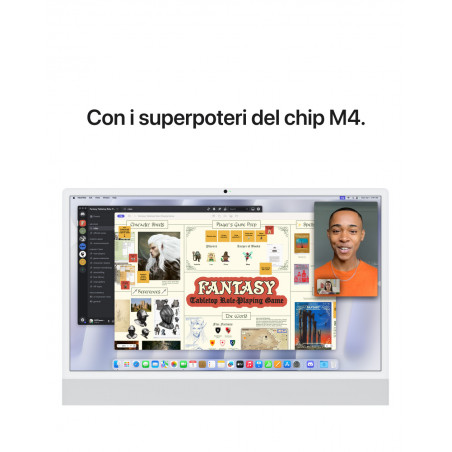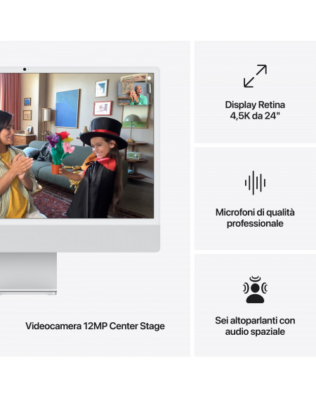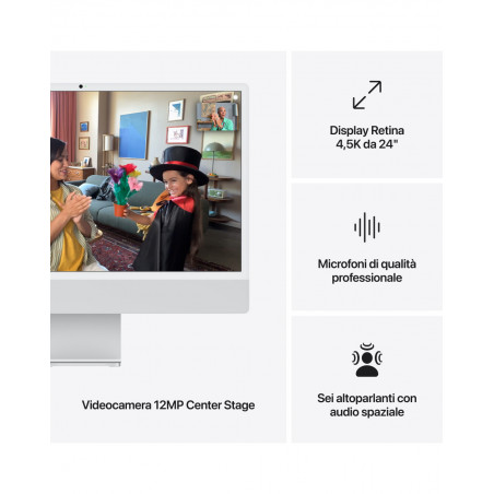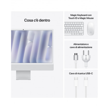 Caratteristiche principali - SI ADATTA PERFETTAMENTE AL TUO SPAZIO – Design all-in-one ultrasottile, in sette splendidi colori: un tocco di stile per ogni stanza. - PROGETTATO PER APPLE INTELLIGENCE — Apple Intelligence è il sistema di intelligenza personale che rende più facile scrivere, creare e fare tutto ciò che vuoi. E grazie a funzioni di privacy di ultima generazione, hai la certezza che nessuno potrà accedere ai tuoi dati, nemmeno Apple. - I SUPERPOTERI DI M4 — Con il chip M4 fai ancora più cose, più velocemente. Creare presentazioni, ritoccare foto, giocare: iMac è fulmineo in tutto. - DISPLAY SPETTACOLARE - Il display Retina 4,5K da 24" offre 500 nit di luminosità e supporta fino a un miliardo di colori. Disponibile anche con nanotexture opzionale, per ridurre al minimo riflessi e bagliori. Disponibile per i modelli in argento con 4 porte. - VIDEOCAMERA E AUDIO EVOLUTI — La videocamera 12MP Center Stage ti tiene sempre al centro della scena, mentre i tre microfoni di livello professionale e i sei altoparlanti con audio spaziale garantiscono un audio ottimale. - IL CHIP APPLE METTE IL TURBO ALLE APP – Quelle che usi di più, come Microsoft Excel, Adobe Photoshop e Zoom, vanno a tutta velocità su macOS. - SE AMI IL TUO IPHONE, AMERAI ANCHE IL MAC – Il Mac funziona in perfetta sintonia con gli altri dispositivi Apple. Copia e incolla qualcosa da iPhone al Mac. E usa il Mac per inviare messaggi di testo o fare e ricevere chiamate FaceTime. - SI CONNETTE A TUTTO — iMac ti mette a disposizione fino a quattro porte Thunderbolt 4, così puoi connettere tutti i tuoi accessori e trasferire dati alla velocità della luce. Se ti serve più spazio per vedere quello che fai, puoi collegare anche due monitor 6K. E hai tutta la velocità del Wi-Fi 6E e del Bluetooth 5.3 per le tue connessioni. - PRIVACY E SICUREZZA SONO DI SERIE — Ogni Mac è dotato di robuste protezioni contro virus e malware. Se perdi il tuo Mac o ti viene rubato, Dov’è può aiutarti a ritrovarlo. FileVault si assicura che i tuoi file siano protetti dalla crittografia, così solo tu puoi accedere. E gli aggiornamenti di sicurezza gratuiti contribuiscono a proteggerlo ancora di più.