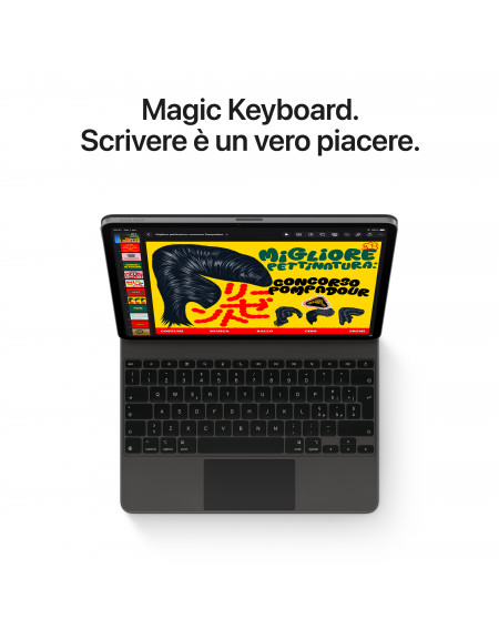 La Magic Keyboard è l’anima gemella di iPad Air. È disponibile in nero o bianco. Elegante e portatile, è comodissima per scrivere e il suo trackpad è perfetto per i lavori che richiedono grande precisione. Ha anche 14 tasti funzione, un connettore USB‑C per la ricarica pass‑through e, quando è chiusa, protegge il tuo iPad Air davanti e dietro. Il design a inclinazione libera ti permette di regolare l’angolazione proprio come vuoi e, grazie all’ampio trackpad in vetro, puoi interagire con iPadOS in modi nuovi.