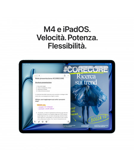 iPad Air 13". Progettato per Apple Intelligence.iPad Air, ora con i superpoteri di M4. Incredibile, nelle prestazioni e nel prezzo. Ha uno splendido display Liquid Retina, una videocamera frontale Center Stage da 12MP per videochiamate perfette, iPadOS, Wi Fi 7 e 5G ultrarapidi. Inoltre puoi usarlo con Apple Pencil Pro, con la Magic Keyboard per iPad Air e con altri accessori, per lavorare, studiare, giocare e creare facilmente, anche in multitasking.