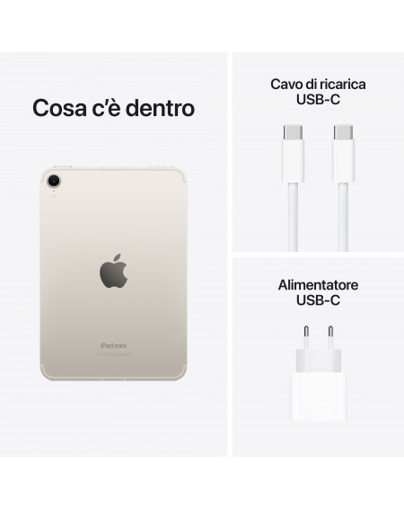 iPad mini è incredibilmente potente per dimensioni così ridotte. Ha il velocissimo chip A17 Pro e un display Liquid Retina da 8,3",[1] e puoi usarlo con Apple Pencil Pro per studiare, lavorare, creare e divertirti ovunque ti trovi.• DISPLAY LIQUID RETINA DA 8,3"[1] — Lo splendido display Liquid Retina ha tecnologie evolute come il True Tone e un’ampia gamma cromatica P3, oltre a una riflettanza ridotta al minimo: per questo ti dà immagini assolutamente spettacolari. • PERFORMANCE E SPAZIO DI ARCHIVIAZIONE — Il chip A17 Pro è un concentrato di potenza e ti dà prestazioni grafiche ultraveloci per i giochi. E grazie a una batteria che dura tutto il giorno,[4] iPad mini è sempre pronto a seguirti in tutto quello che fai. Con archiviazione a partire da 128GB: spazio a volontà per app, musica, film e tutto quello che vuoi.[5] • IPADOS + APP — iPadOS rende il tuo iPad più efficiente, intuitivo e versatile. Con iPadOS puoi usare più app alla volta, scrivere a mano nei campi di testo con Apple Pencil, e ritoccare e condividere le foto. Tante app indispensabili, come Safari, Messaggi e Keynote, sono già di serie su iPad mini, e sull’App Store ne trovi oltre un milione. • APPLE PENCIL E SMART FOLIO — Apple Pencil Pro trasforma il tuo iPad mini in una tela con tutto quel che ti serve per dipingere, o nel più pratico dei quaderni. Anche Apple Pencil (USB C) è compatibile con iPad mini. E la cover Smart Folio, sottile e disponibile in quattro colori, protegge il tuo iPad mini ed è perfetta anche come supporto. Accessori in vendita separatamente. • FOTOCAMERE EVOLUTE — iPad mini ha una fotocamera frontale da 12MP con ultra grandangolo e Inquadratura automatica per selfie e videocall. La fotocamera posteriore da 12MP con grandangolo e flash True Tone è perfetta per fare scansioni di documenti, scattare foto e girare video 4K. • SBLOCCA E PAGA CON TOUCH ID – Il Touch ID è integrato nel tasto superiore: basta un tocco per sbloccare l’iPad mini, accedere alle app e pagare i tuoi acquisti in totale sicurezza con Apple Pay. • CONNETTIVITÀ — Con il Wi-Fi 6E puoi contare su connessioni wireless superveloci[3] per lavorare pressoché ovunque e trasferire in un attimo foto, documenti e video di grandi dimensioni. E il connettore USB-C offre connessioni rapidissime.