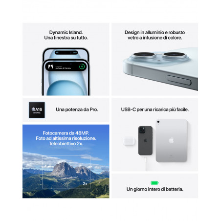 POTENTISSIMO CHIP A16 BIONIC – Il chip ultraveloce permette funzioni evolute come la fotografia computazionale, le transizioni fluide della Dynamic Island, e la modalità “Isolamento vocale” per le chiamate. Ed è anche incredibilmente efficiente, così la batteria dura tutto il giorno.