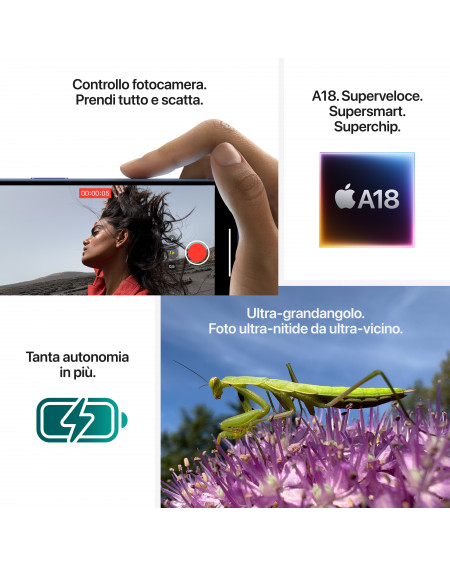 • CHIP A18 SUPERSMART — Il chip A18 fa un salto di due generazioni rispetto all’A16 Bionic di iPhone 15. È il motore per foto e video, come il Controllo fotocamera, con un’efficienza energetica fenomenale.