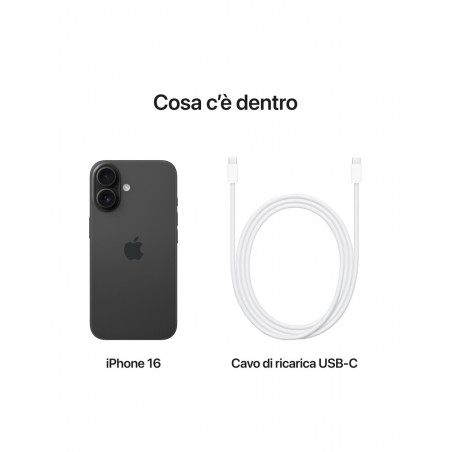 • CONTROLLO FOTOCAMERA. PRENDI TUTTO E SCATTA — Grazie a Controllo fotocamera puoi accedere al volo agli strumenti per foto e video, come zoom e profondità di campo: basta un attimo per cogliere l’inquadratura perfetta. • NIENTE È TROPPO PICCOLO. O TROPPO GRANDE — L’ultra-grandangolo migliorato con autofocus regala dettagli incredibilmente nitidi a foto e video macro. Con la fotocamera Fusion da 48MP puoi catturare splendide immagini ad alta risoluzione, e il teleobiettivo 2x di qualità ottica consente di zoomare sul soggetto. • STILI FOTOGRAFICI — Con gli Stili fotografici di nuova generazione hai più possibilità creative per rendere ogni foto ancora più tua. E se ci ripensi, puoi sempre tornare alla foto originale. • CHIP A18 SUPERSMART — Il chip A18 fa un salto di due generazioni rispetto all’A16 Bionic di iPhone 15. È il motore per foto e video, come il Controllo fotocamera, con un’efficienza energetica fenomenale. • PIÙ AUTONOMIA — iPhone 16 lavora in sinergia con il chip A18 per darti tanta autonomia in più: fino a 22 ore di riproduzione video. Ricarica via USB-C o aggancia un caricabatterie MagSafe per ricaricare in wireless ancora più velocemente. • PROGETTATO PER DURARE — iPhone 16 ha un robusto guscio in alluminio aerospaziale con display Super Retina XDR da 6,1". E la parte frontale è in Ceramic Shield di ultima generazione, due volte più forte di qualsiasi vetro per smartphone. • IL TASTO AZIONE – Un modo rapido per accedere alla tua funzione preferita. Basta premerlo per attivare all’istante la modalità Silenzioso, registrare un memo vocale, accendere la torcia o fare quello che vuoi tu. • PERSONALIZZA IL TUO IPHONE — Con iOS 18 puoi cambiare il colore delle icone sulla schermata Home, trovare subito le tue foto preferite nell’app Foto ridisegnata, e dare vita alle tue parole ed emoji con i divertenti effetti animati che trovi in iMessage. • FUNZIONI PER LA TUA TRANQUILLITÀ – Con Rilevamento incidenti, iPhone può riconoscere un grave incidente d’auto e chiamare aiuto se tu non puoi.