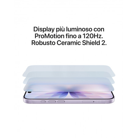 - DISPLAY DA 6,3" CON PROMOTION: PIÙ LUMINOSO E BRILLANTE — Con la tecnologia ProMotion fino a 120Hz tutto scorre alla grande, e 3000 nit di luminosità di picco garantiscono un contrasto migliore all’aperto. E il display ha il 33% di riflessi in meno.