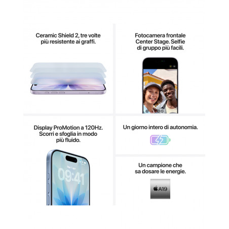 - NATO PER PIACERE, FATTO PER DURARE — iPhone 17 è disponibile in cinque splendidi colori, ha un display da 6,3" più luminoso e la parte frontale in Ceramic Shield 2, tre volte più resistente ai graffi.