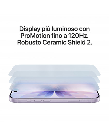 - DISPLAY DA 6,3" CON PROMOTION: PIÙ LUMINOSO E BRILLANTE — Con la tecnologia ProMotion fino a 120Hz tutto scorre alla grande, e 3000 nit di luminosità di picco garantiscono un contrasto migliore all’aperto. E il display ha il 33% di riflessi in meno.