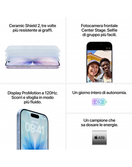 - CHIP A19: UN CAMPIONE CHE SA DOSARE LE ENERGIE — Con una GPU 5 core, il Neural Engine migliorato scatena Apple Intelligence, i giochi più evoluti e tutto quel che fai sul tuo iPhone.