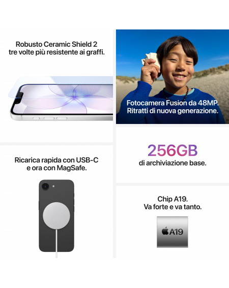 iPhone 17e ha una miriade di cose in comune con iPhone 17 ma a un prezzo ridotto. Tra i suoi pezzi forti troverai Ceramic Shield 2 ultraresistente ai graffi, chip A19 di ultima generazione, fotocamera Fusion da 48MP, ricarica wireless veloce con MagSafe, USB‑C e archiviazione a partire da 256GB. Insomma, ha il bello di un iPhone. A un bel po’ di meno.