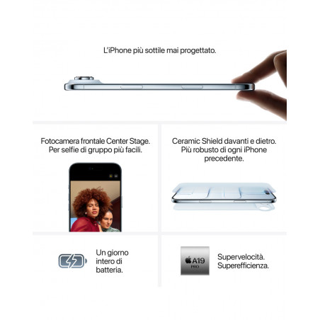 Il nuovo chip A19 Pro garantisce velocità eccezionali, efficienza energetica e prestazioni ottimizzate per l’intelligenza artificiale e la realtà aumentata. Grazie alla batteria di lunga durata e al sistema operativo iOS di ultima generazione, iPhone Air è pronto a tutto: dal lavoro creativo alla condivisione dei momenti più importanti.