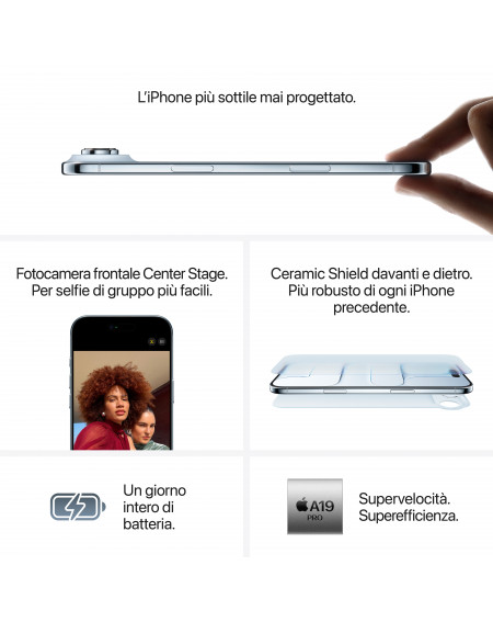 Il nuovo chip A19 Pro garantisce velocità eccezionali, efficienza energetica e prestazioni ottimizzate per l’intelligenza artificiale e la realtà aumentata. Grazie alla batteria di lunga durata e al sistema operativo iOS di ultima generazione, iPhone Air è pronto a tutto: dal lavoro creativo alla condivisione dei momenti più importanti.