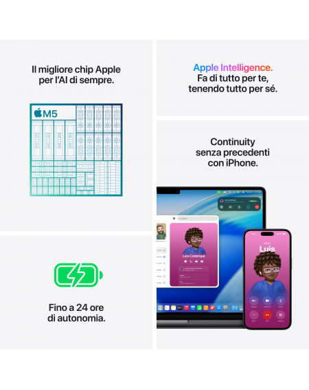 - CON I SUPERPOTERI DI M5 – Oltre a una CPU e una memoria più veloci, il chip M5 ha una GPU più potente con un Neural Accelerator in ogni core, per mettere il turbo quando si usa l’AI. Così puoi sfrecciare a velocità incredibili anche nei lavori più complessi.