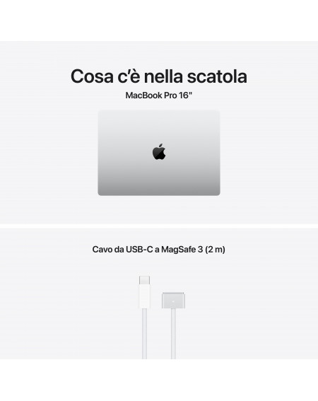 - ALIMENTATORI – N.B. MacBook Pro (16") con M5 Pro e M5 Max include un cavo di ricarica da USB C a MagSafe 3 senza alimentatore. Per ricaricare questo dispositivo è necessario un alimentatore USB C o un’altra fonte di alimentazione USB PD da almeno 94W. Per una ricarica ottimale, Apple consiglia l’alimentatore USB C Apple da 96W, oppure l’alimentatore USB C Apple da 140W per gestire i flussi di lavoro più impegnativi e per sfruttare la ricarica rapida (fino al 50% di carica in 30 minuti).