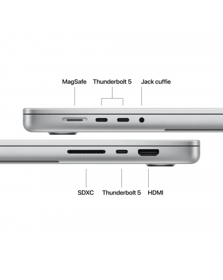 MacBook Pro include una serie completa di porte per collegare periferiche veloci, monitor ad alta risoluzione o schede SDXC. I modelli con chip M5 hanno porte Thunderbolt 4 e supportano le tecnologie Wi‑Fi 6E50 e Bluetooth 5.3. I modelli con chip M5 Pro o M5 Max hanno porte Thunderbolt 5, per una velocità di trasferimento fino a 120 Gbps.